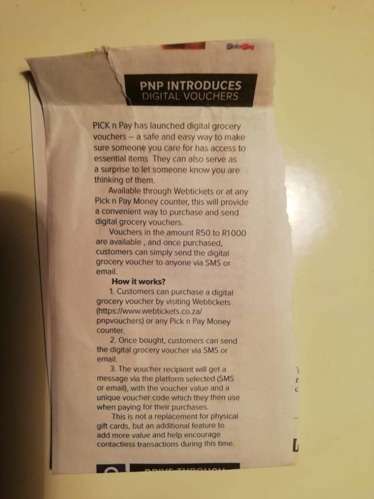 We then explored other ways for members who are NOT able to do EFT’s into the church bank account, and there is a “DIGITAL GROCERY VOUCHER” available from Pick n Pay. Pick n Pay digital grocery vouchers are a safe and easy way to get groceries and utilities like electricity, data and airtime to someone in need. Surprise a loved one with a gift, support a local charity or help someone who needs it most!
