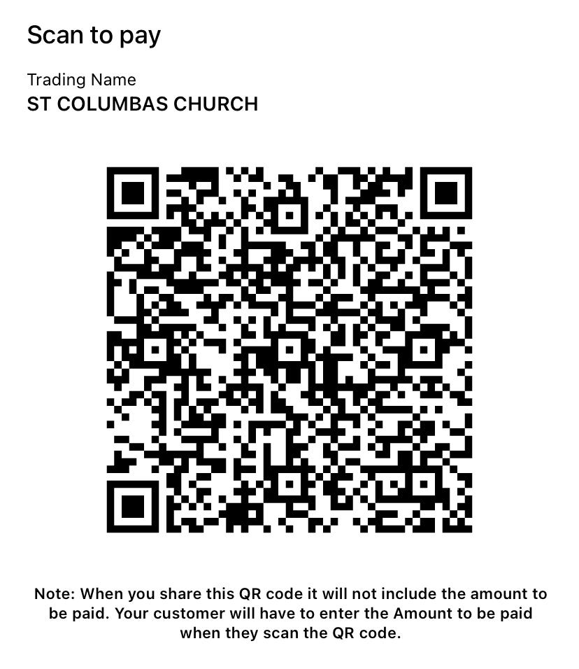 Hi everyone. St Columba’s now has a QR code for those who scan and pay or snap scan, at shops etc. This works in the exactly the same way as you would in a restaurant where you can scan and pay, often know as snapscan. Please share this code with your family and friends and on posters, and church leaflets, bulletins, etc. This is another easy payment mechanism where congregations can put the QR code at the entrance to a church on a poster, for members and visitors to transfer money or donate easily when entering or exiting. It does carry a bank charge of 2% of the money donated whereas an EFT to the congregation is free of bank charges so if you use EFT continue to do so, but the QR code is a wonderful way to reach out to more people outside the congregation.