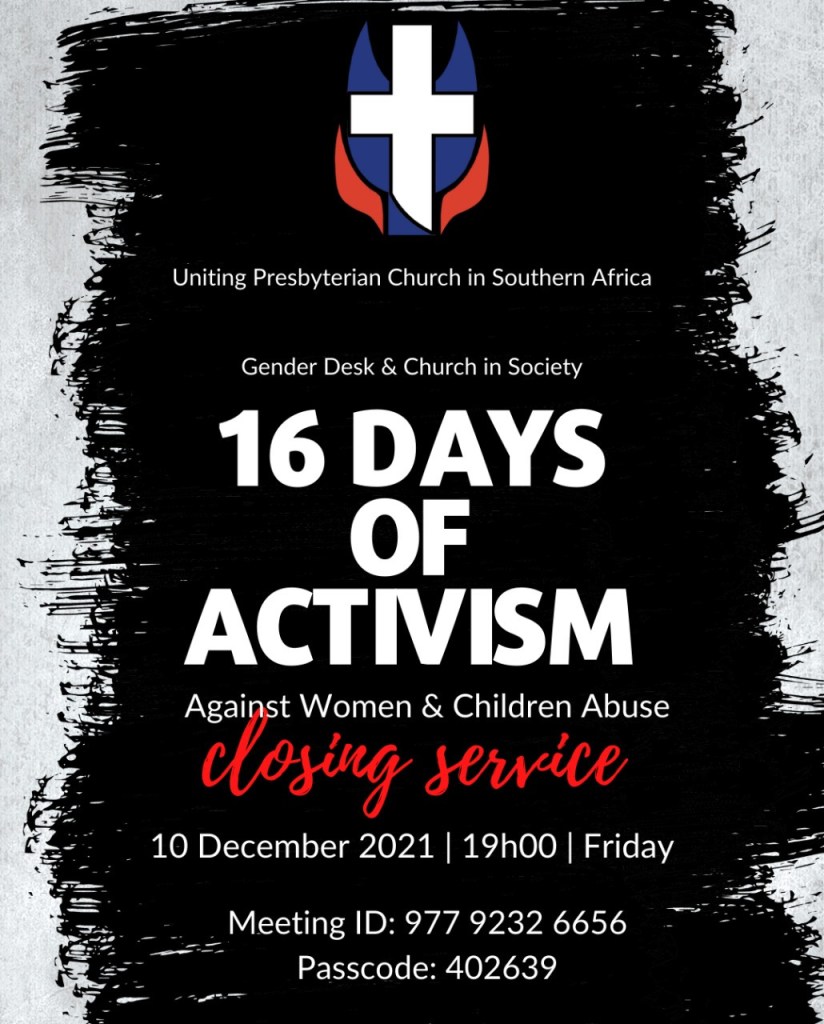 You are all invited to participate in the service to mark the end of the 2021 version of the 16 Days of Activism against Violence on Women and Children. The service will be held tomorrow, Friday, the 10th of December
