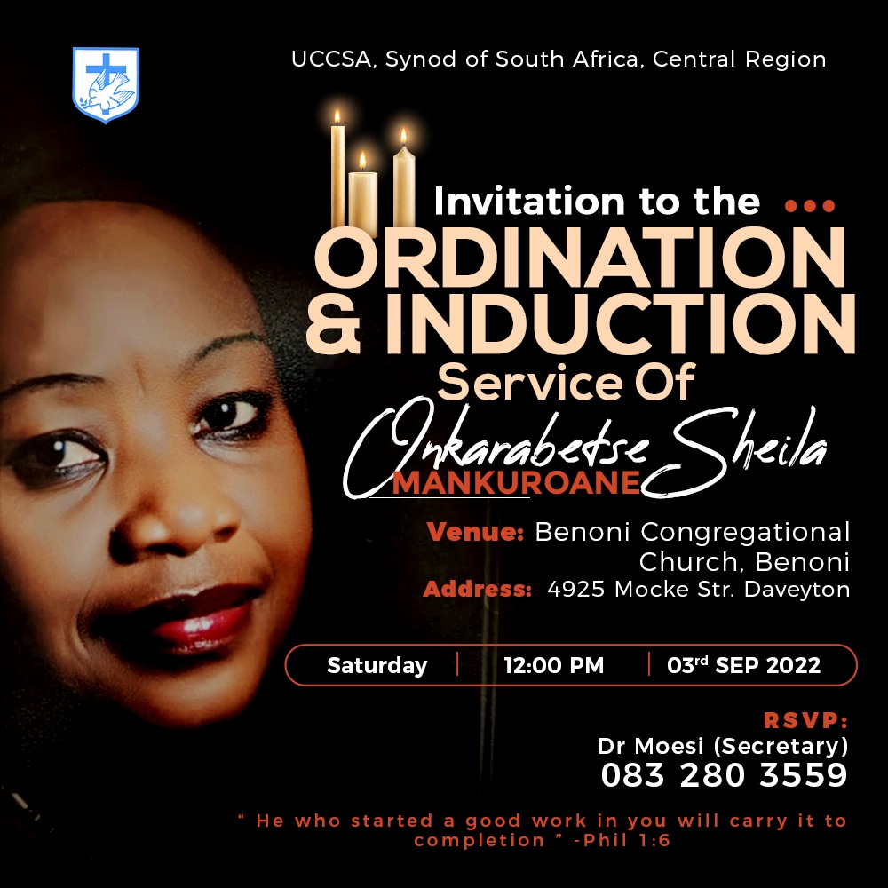 AnnouncementsInvitation to the Ordination and Induction of our former Intern Minister, our Sister Onkarabetse Sheila Mankuroane 26/08/202226/08/2022 St. Columba's Presbyterian Church Hatfield Share this: Click to share on X (Opens in new window) X Click to share on Facebook (Opens in new window) Facebook Like Loading... Related