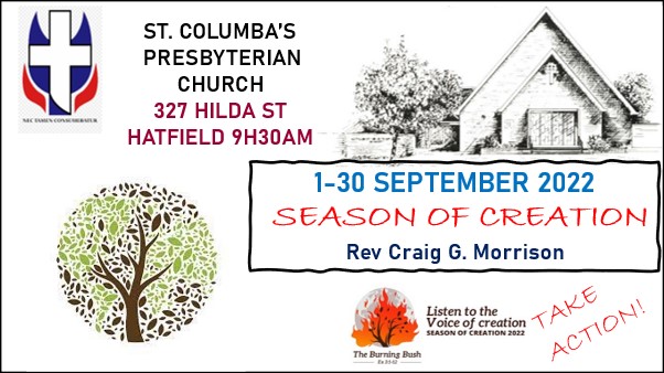 AnnouncementsSeason of Creation – 1-30 September 2022 01/09/2022 St. Columba's Presbyterian Church Hatfield Share this: Click to share on X (Opens in new window) X Click to share on Facebook (Opens in new window) Facebook Like Loading... Related