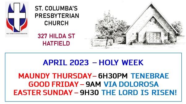 Sunday ServicesGood Friday Service – 7 April 2023, by Rev Craig Morrison 07/04/2023 St. Columba's Presbyterian Church Hatfield Service audio https://drive.google.com/file/d/16paHQwqf840spYxCUC6uHHoxLLHcxpWk/view?usp=drivesdk Share this: Click to share on X (Opens in new window) X Click to share on Facebook (Opens in new window) Facebook Like Loading... Related
