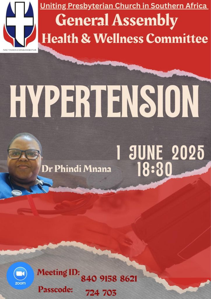 The General Assembly Health and Wellness committee is very pleased to invite the UPCSA family and all interested/affected by Hypertension to join us on Sunday 1 June 2025 at 18:30 when we will be hosting an informative session on the disease causing High Blood Pressure.